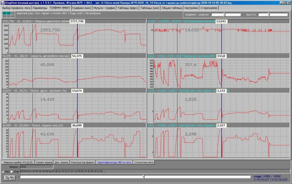 24. 1. " ... немогу нигде сам посмотреть... ". Неужели нет в хозяйстве компьютера? Чудеса ... 2. "...последняя строка в опендиаг (форсунка 1) постоянно скачут...". Не обращайте на это внимания. Там нужен знаковый параметр, а используется обычный. В DiagView такая же ошибка. Если не забуду - исправлю в следующей версии анализатора. 3. В логе нет АЦП, но я бы обратил внимание на ДМРВ (см.вложение)... Одно и то же значение МРВ на протяжении всего лога...