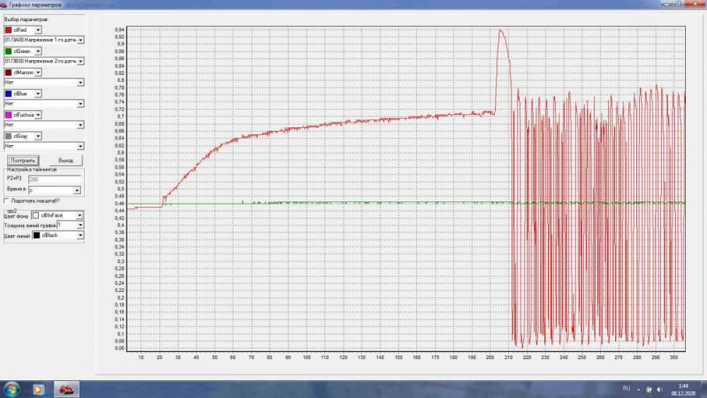 3. Снял логи без катализатора с обычным ДК2 и с припаянным резистором 200кОм в разрыв черного провода и конденсатором 4.4мФ между черным и серым. Сейчас езжу с данной обманкой, ошибок никаких нет. Скачки напряжения на ДК2, скорее всего связаны с тем, что ДК2 холодный, по график видно, что он только включился в работу. Другой лог снят во время долгой поездки. 1.rar