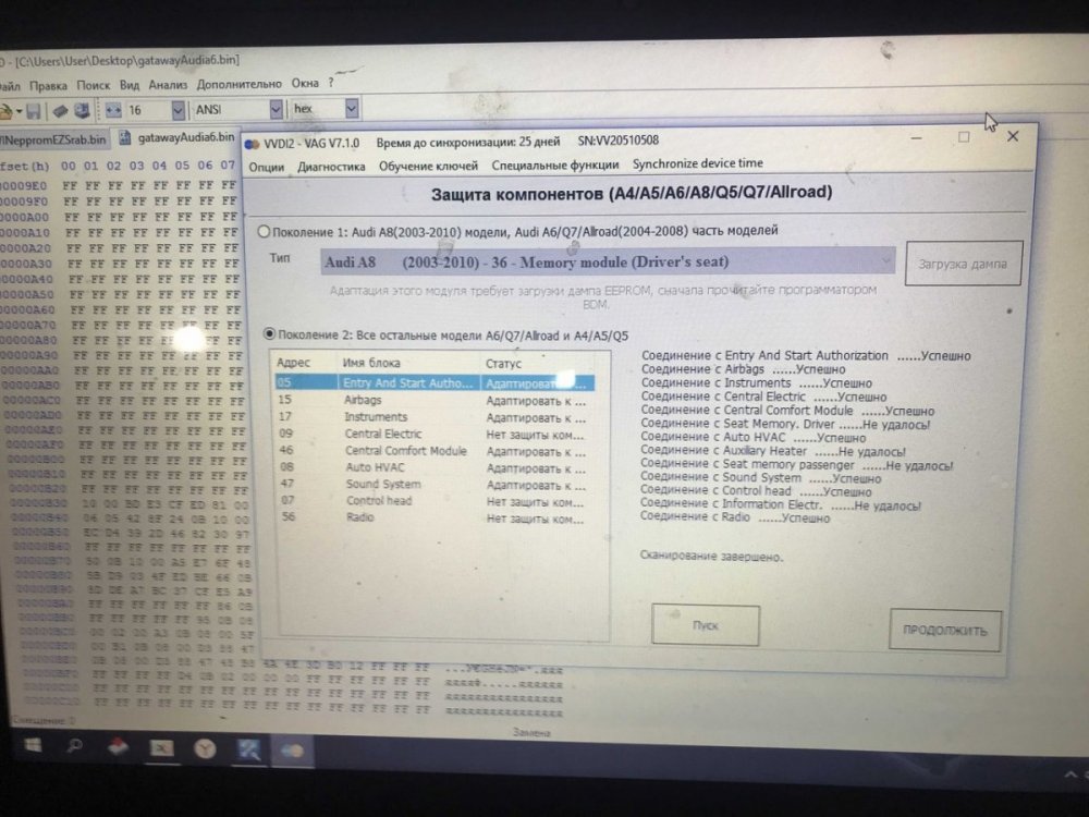 Audi A6 Quattro Allroad 2006 год. Vin WAUZZZ4F67N057295. Доброго времени ребята ПОМОГИТЕ!!! История такая. Пригнали авто, говорят купили с утерянными ключами, сделали они мех болванку вставили зажигания не включается, защелка замкнута. Снял защелку считал дамп и еепром, там полнейшая ерунда, не вина ни номеров ни ключей, залил дамп с рабочей защелки толку ноль. купил защелку с ключем рабочую поставил все разблокировалась зажигание включается, естественно сработала защита компонентов. Пытаюсь связать защелку с блоком двигателя. VVdi требует подождать доступ безопасности, жду вторую неделю, ни как с двигателя не читает cs mac pin. Сливаю K-tagom с блока двигателя все, смотрю еепром, а там вин совсем другой (с ауди а6 авант), блок двигателя по номеру родной. И тут я завис!!! Вин в защелке пробовал править и по двигателю и по кузову, толку ноль. Дампы прилагаю, ODISа онлаин нет. ViNeepromEZS это мной правленный под машину. Родной который нужно вин в самом верху audia6ECU.rar EZSrabochii.rar gatawayAudia6.bin VINeppromEZSrab.bin- VVDI & VVDI 2