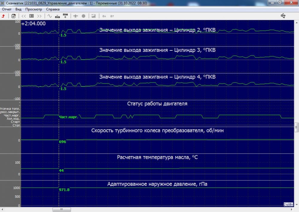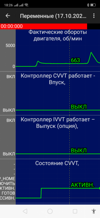 Смотрел. Заданные и фактические углы совпадают, как по сканеру, так и со всеми эталонами. Но дальнейшего управления нет. Что то не дает ЭБУ управлять фазами, хоть не месте, хоть под нагрузкой в движении
