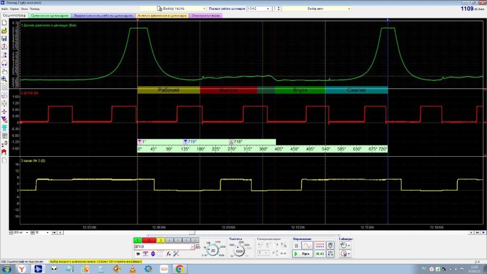 осцилограмма записана на в момет пока двигатель работает (3-4 секунды) конкретно на этот двигатель осцилограму я не нашел, неа rotkee сайте нету именно этого двигателя и я смотрел по кия такой двигатель. думаю еще в этом может быть проблема. нет эталона. но если верить клиенту вчера работало - утром не завелось. механически я всё посмотрел метки даже пробовал на зуб туда и сюда перекидывать.