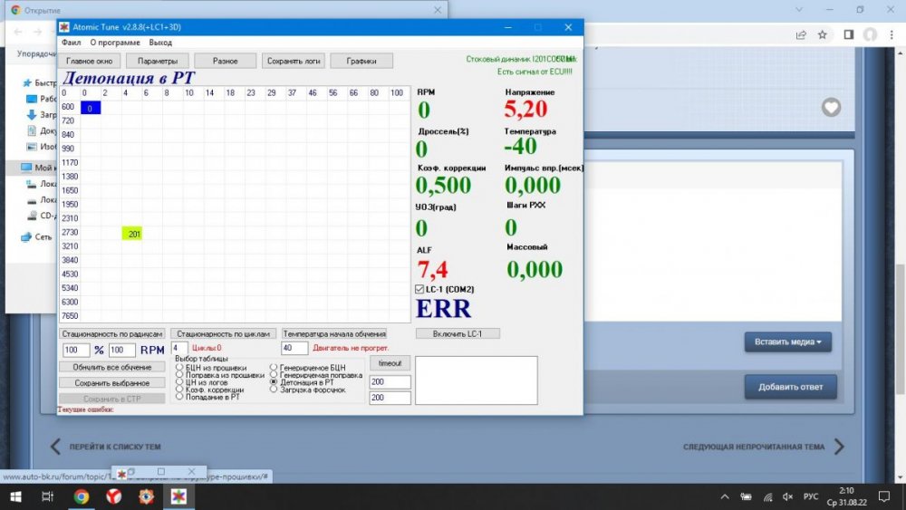 Здравствуйте дорогие форумчане . Нужен ваш совет, попробую объяснит суть вопроса. Собрал себе кабель для прошивки своего Январь 7.2 Руки в этом плане заточены правильно . Заводская прошивка Эбу была I201co57, машина Лада Калина 1.6 8кл. Хотел спросить вопрос по структуре прошивки, вопросов конечно много, 1 из них не первоочередной, в плане технической модернизации переделки дад на дмрв. Вопрос проводки ДАД на ДМРВ не проблема, спаяю как надо. Суть адаптации не прошивая прошивками j7 версии, это принципиально, а именно модернизировать работу ДАД в условно заводскую структуру прошивки путем изменения инверсии кривой 0----5в тарировки ДМРВ. Но это пока всё в мыслях. Ребят нужен совет вот по такому вопросу, возможно всё немного занудно, прошу сильно не пинать. У нас в городе весь бензин делается не из нефти, а из газа, октановое число Аи80, есть и 92 но он весь на какой то химии, вообще не вариант его лить, нормальный российский бензин стоит очень дорого. Суть вопроса в следующим. Прошивка меня полностью устраивает, прет реально обалденно и это на аи80, но есть детонация в одной точке, а именно 4% дроселя на 2730 оборотов двигателя, всё это я вижу в программе Atomic Tune, углы в трёх картах чуть завышены от заводских, прошивку я собирал сам. Часть от заводской, в плане пуска и переходных режимов, всё остальное, с учётом набранной информации, клеил сам. Прошивка с ДК но до 1170, чтоб холостой был идеален. Дело в том что в программе нет попадания в рабочую точку где происходит детонация. Подскажите пожалуйста каким параметром можно избавиться от детонации в этой точки. Углом/ Топливной картой или таблицей коррекции ПЦН по положению дросселя и оборотов , я точно не знаю, но предполагаю что этими картами можно убрать детонацию в рабочей точке 4% дросселя на 2730 оборотов. Очень нужен ваш совет, подскажите пожалуйста.- 2 Режима Январь 7.2