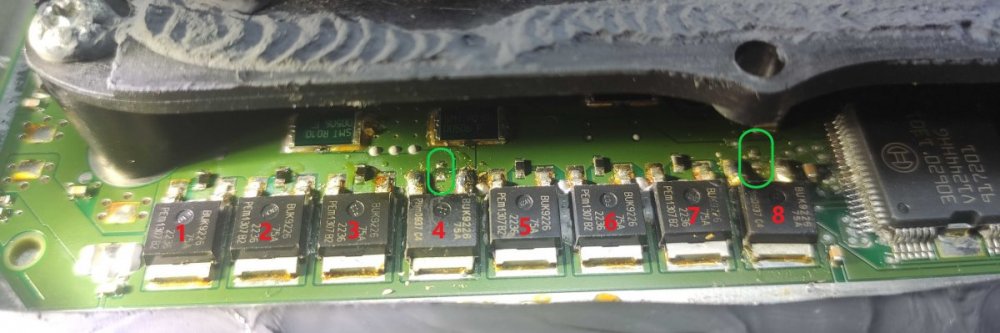 Куплен блок кот в мешке с шильдиком КАМАЗ. Не глядя прошит (не мной) под камаз 8 цилиндров. Заводится и глохнет. Выдает следующие ошибки: 1832, 1864 (неисправность силового каскада управления форсунками 1й и 2й группы - неизвестная ошибка) и 2177 - Число работающих цилиндров меньше заданного минимального предела, двигатель остановлен - Работают не все цилиндры. Вскрыл блок, видны следы пайки ВЫВОДОВ транзисторов форсунок 7 и 8 цилиндров (это номера 4 и 8 на фото), но стоки ключей воде как и не тронуты, видно, что транзисторы из другой партии. Смущает, что нет подтягивающих резисторов у этих транзисторов (отмечены зеленым). Находил фото такого блока чтобы видны были эти ключи - нам нем все резисторы стоят. Сопротивление установленных резисторов 47кОм (измерил выпайкой), вроде как впаял и попробовал, но машина далеко и есть нюанс. Если измерять сопротивление между истоком и затвором, то у нечетных транзисторов сопротивление одно, а четных другое. Выпаял затворные резисторы и сопротивление исток-затвор у нечетных 56кОм, а четных мегаомы. Так и должно быть или что то с драйвером? Где вообще находится драйвер форсунок? Вызванивал на микросхему, что справа - не звонится.