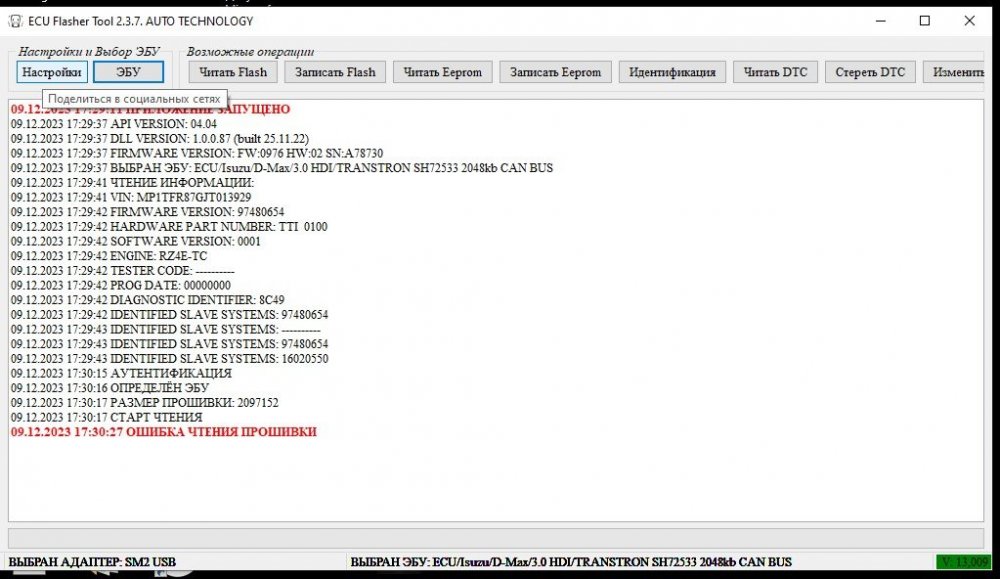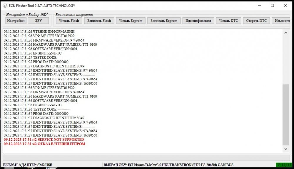 4. идентифицирует успешно. но мне может считать еепром и flash/ Isuzu MU-X 1.9 Ddi 150 л. с. ЭБУ: Transtron HW: TTI 0100 SW: 97480654 VIN nr.: MP1TFR87GJT013929 Installation: RZ4E-TC и, как то мне не очень цифры нравятся, как будто крутили уже что то..