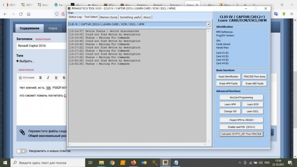 Нет ключей, есть ISK F682F401AFA34615CD10DF6F76FA2AFB PIN 7D557F8405499E6ABA009579A801AE23 , D_Flash кто сможет помочь посчитать Cry pto_key from Pincode эта функция есть в RENAULT ECU TOOL ? Заранее спасибо D_Flash_Captyr.bin