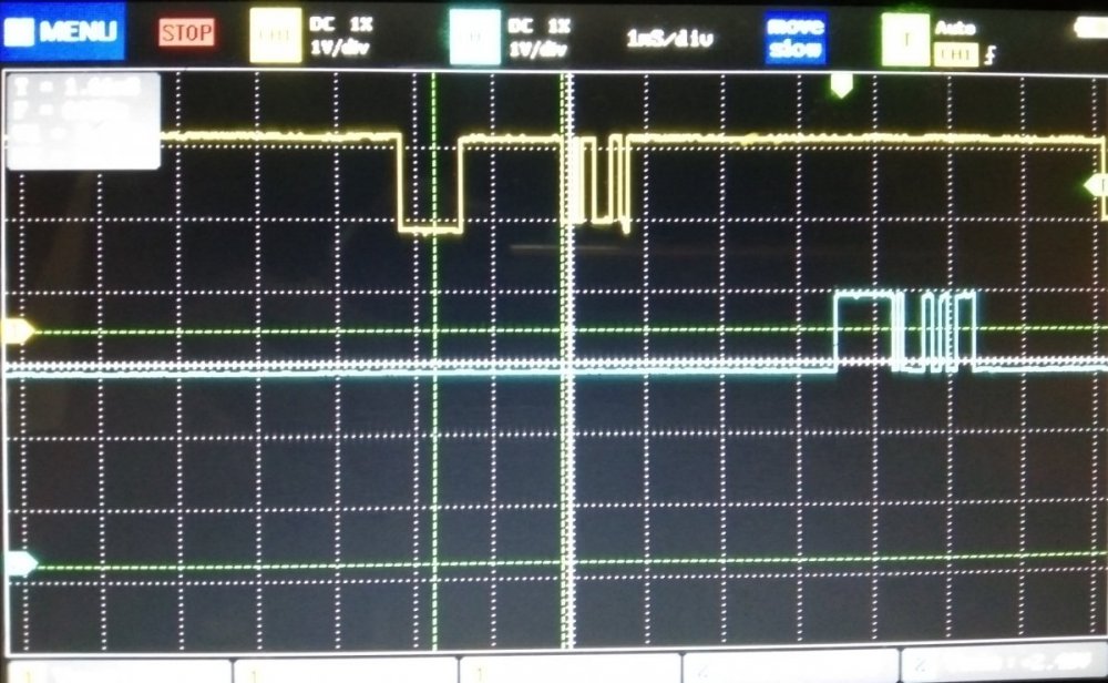 Всем доброго времени! Сегодня смотрел Мазду сх7 2008 с проблемой периодического ухода АКПП в аварийный режим. Ошибки непостоянные, всегда разные и все по отсутствию связи между блоками на Кан шине. Повесил осциллограф на шину - уровни нормальные, импульсы не кривые, однако заметил несколько раз вот такую картину, что бы это значило?