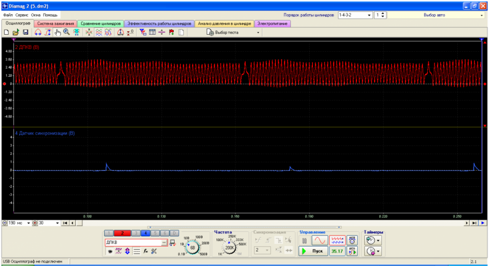 На этих днях только получилось снять осцилограмму работы датчика коленвала. Может есть у кого исправная осцилограмма для сравнения я свою прилагаю сюда, сами файлы больших размеров можно будет на почту отравить
